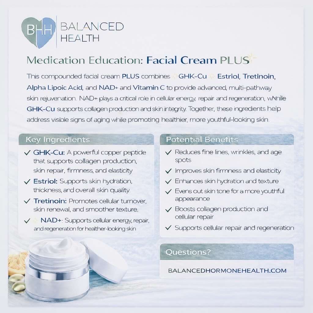 This compounded facial cream PLUS combines GHK-Cu, Estriol, Tretinoin, Alpha Lipoic Acid, and NAD+ and Vitamin C to provide advanced, multi-pathway skin rejuvenation. NAD+ plays a critical role in cellular energy, repair and regeneration, while GHK-Cu supports collagen production and skin integrity. Together, these ingredients help address visible signs of aging while promoting healthier, more youthful-looking skin.
