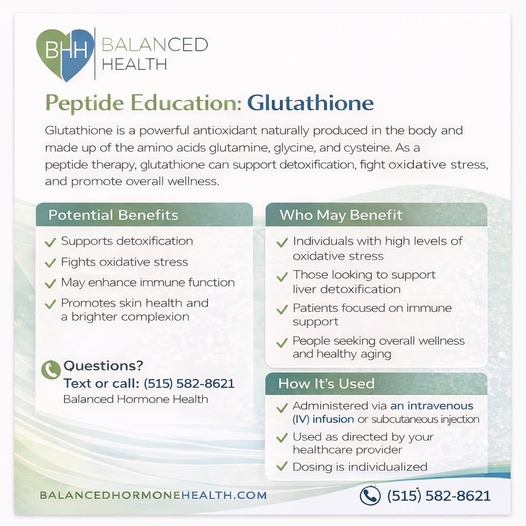 Glutathione is a powerful antioxidant naturally produced in the body and made up of the amino acids glutamine, glycine, and cysteine. As a peptide therapy, glutathione can support detoxification, fight oxidative stress, and promote overall wellness.